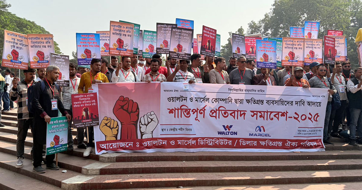 দেশের শীর্ষস্থানীয় ইলেকট্রনিক্স কোম্পানি ওয়ালটন ও মার্সেলের ডিলারদের ন্যায্য পাওনা আদায়, ক্ষতিগ্রস্তদের পুনর্বাসন এবং স্বচ্ছ নীতিমালার দাবিতে আজ কেন্দ্রীয় শহীদ মিনারে এক বিশাল প্রতিবাদ সমাবেশ অনুষ্ঠিত হয়েছে। ‘ক্ষতিগ্রস্ত ওয়ালটন ও মার্সেল ডিস্ট্রিবিউটর ঐক্য পরিষদ’-এর ব্যানারে আয়োজিত এই সমাবেশ থেকে কোম্পানিগুলোর প্রতি ৭২ ঘণ্টার কঠোর আল্টিমেটাম দেওয়া হয়।