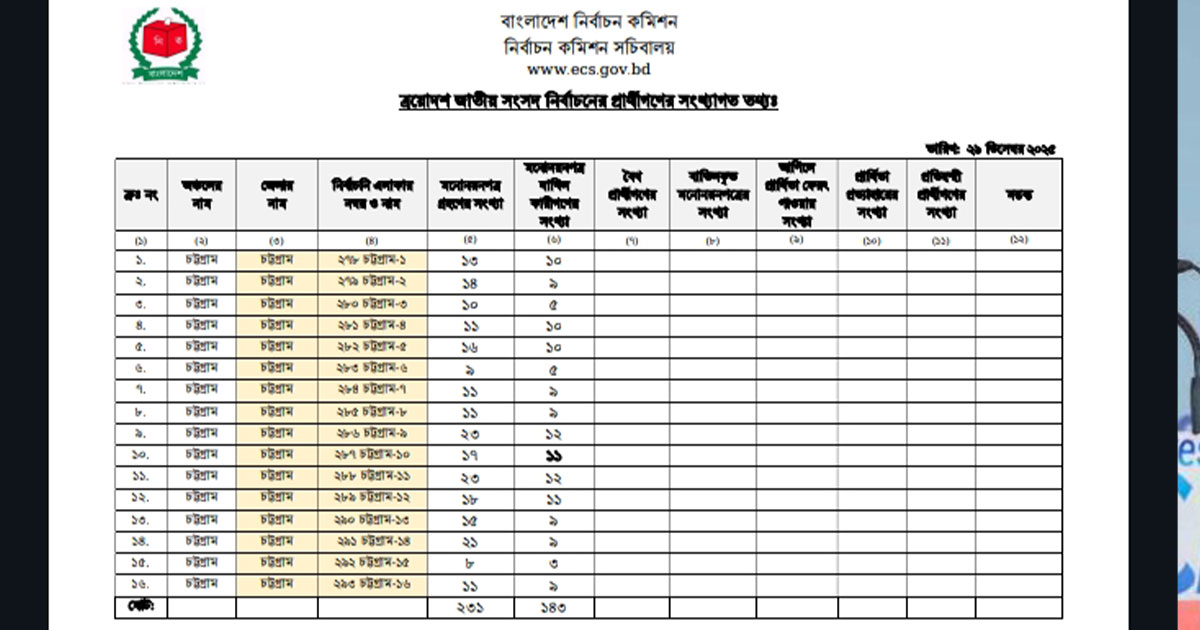 চট্টগ্রামের ১৬ আসনে মনোনয়ন জমা ১৪৩ প্রার্থীর, ভোট ১২ ফেব্রুয়ারি