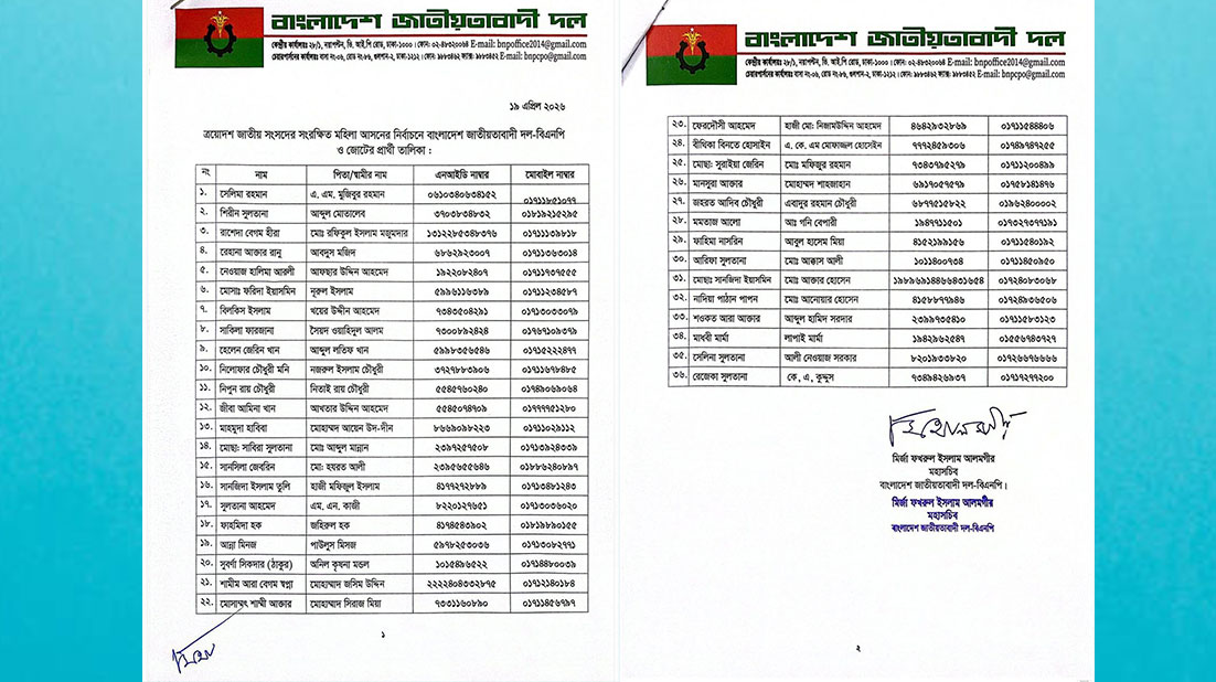 নারী সংরক্ষিত আসনে বিএনপির ৩৬ জনের চূড়ান্ত তালিকা ঘোষণা, প্রাধান্য পেলেন অভিজ্ঞ ও তরুণ নেত্রীরা