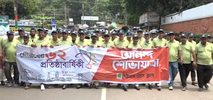 বর্ণাঢ্য আয়োজনের মধ্যদিয়ে চট্টগ্রাম প্রেসক্লাবের ৬২তম প্রতিষ্ঠাবার্ষিকীর দিনব্যাপী অনুষ্ঠান শুরু হয়েছে। বৃহস্পতিবার (৬ জুন) সকালে বর্ণিল বেলুন ও ফ্যাস্টুন উড়িয়ে দিনব্যাপী প্রতিষ্ঠাবার্ষিকীর অনুষ্ঠান উদ্বোধন করেন ক্লাবের সভাপতি সালাহ্উদ্দিন মো. রেজা ও সাধারণ সম্পাদক দেবদুলাল ভৌমিকসহ নেতৃবৃন্দ। এরপর শুরু হয় আনন্দ শোভাযাত্রা।