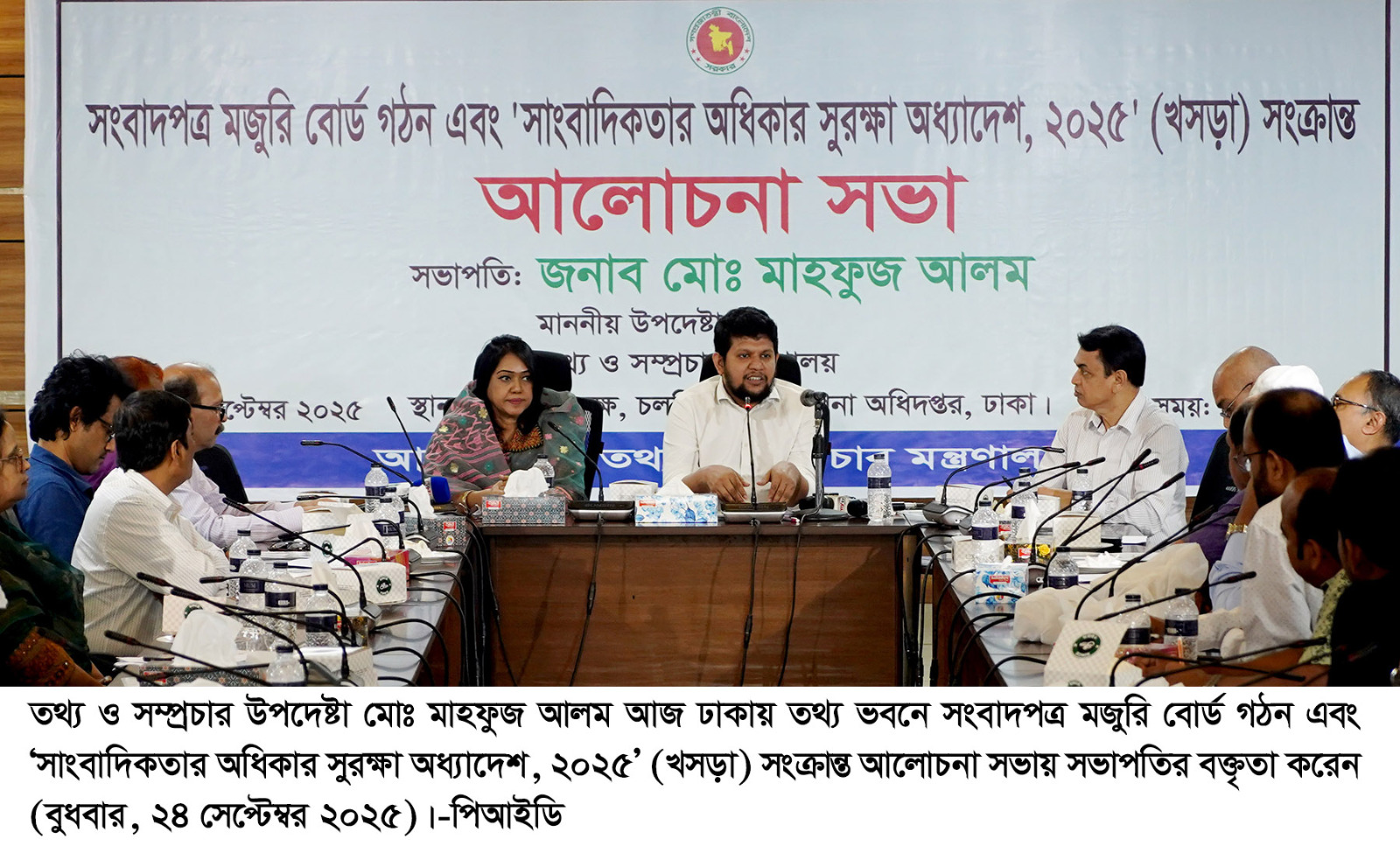 তথ্য ও সম্প্রচার উপদেষ্টা মোঃ মাহফুজ আলম বলেছেন, সাংবাদিকতার অধিকার সুরক্ষা অধ্যাদেশ প্রণয়নে সরকার আন্তরিকভাবে কাজ করছে। বর্তমান অন্তর্বর্তী সরকারের আমলে এই অধ্যাদেশ প্রণয়ন করা সম্ভব হবে বলেও তিনি আশাবাদ ব্যক্ত করেন। বুধবার ঢাকার তথ্য ভবনে ‘সংবাদপত্র মজুরি বোর্ড গঠন এবং সাংবাদিকতার অধিকার সুরক্ষা অধ্যাদেশ, ২০২৫ (খসড়া)’ বিষয়ক আলোচনাসভায় সভাপতির বক্তব্যে উপদেষ্টা এসব কথা বলেন।
