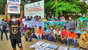 সকালে রোদ থাকলেও শুক্রবার (১৬ জুলাই) বিকেলে ভারী বৃষ্টি উপেক্ষা করে বহু সংগঠন আলাদা আলাদা ব্যানার নিয়ে প্রতিবাদ কর্মসূচি পালন করে।